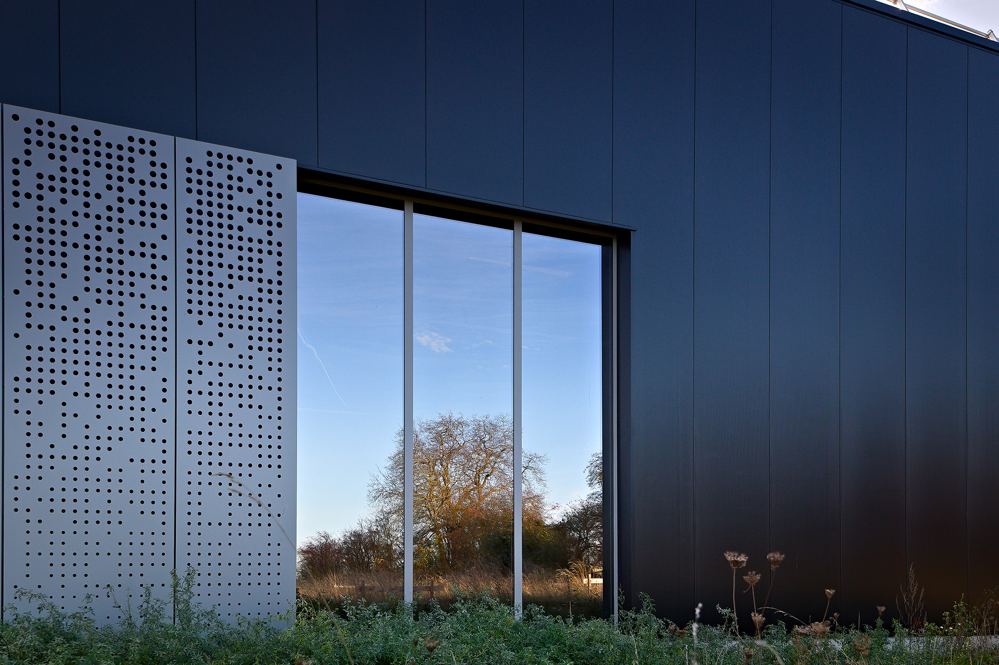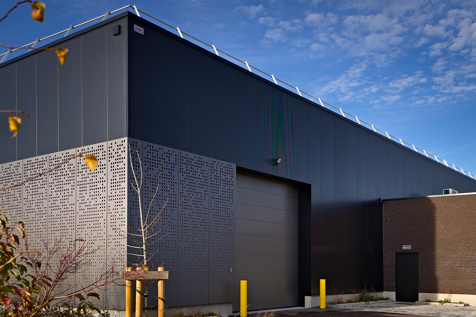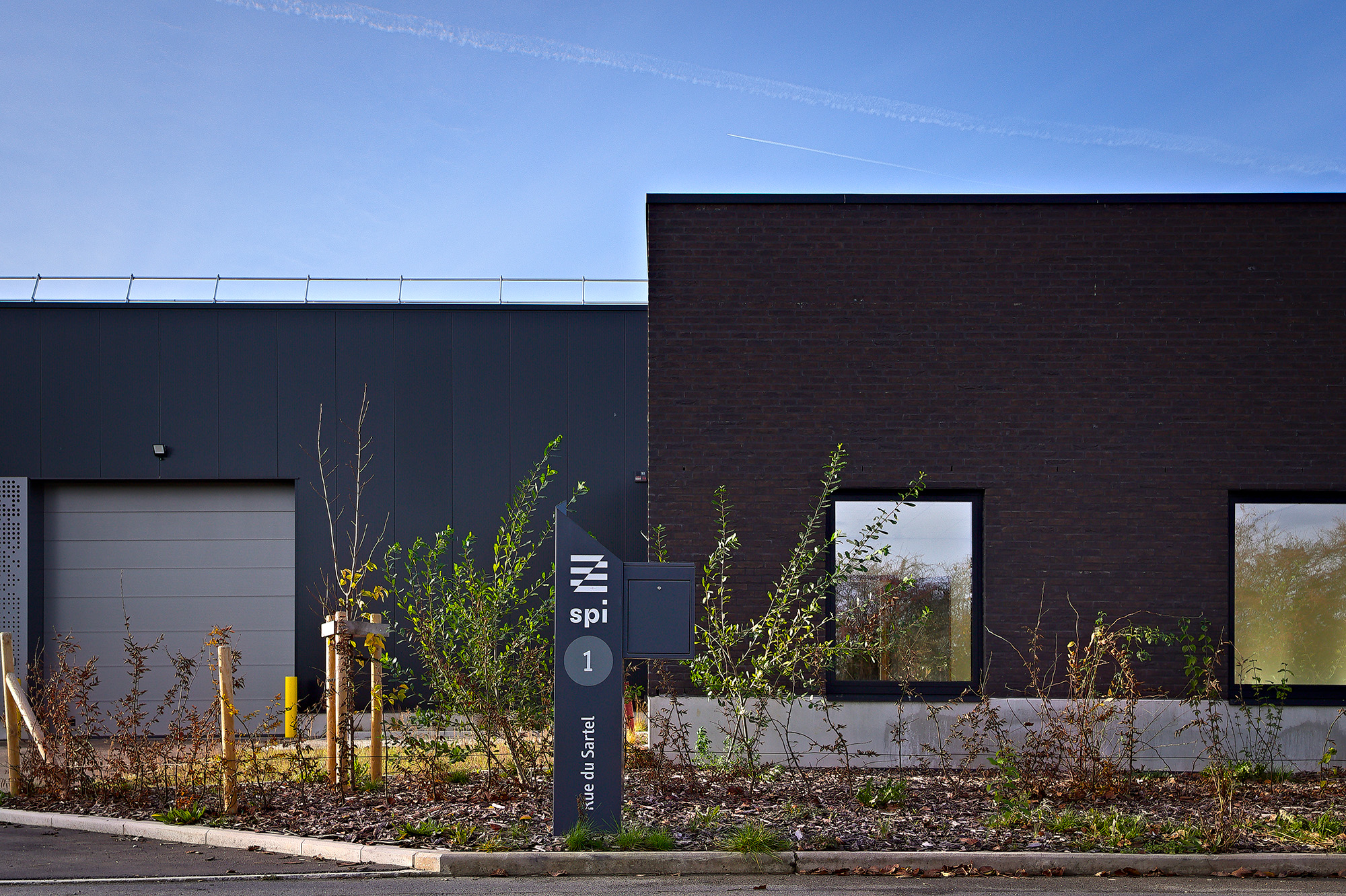 Le projet s’implante dans un nouveau parc économique sur une parcelle à proximité d’une zone résidentielle. Les deux entités sont accolés et en symétrie, destinés à l’accueil de petites entreprises à la location. Les bureaux et les halls sont à toitures plates, avec une structure en béton pour les volumes bureaux et une structure mixte lamelé-collé et béton pour les halls. Le choix des matériaux de façades a été pensé en adéquation avec la charte SPI, à savoir des panneaux métalliques de ton gris foncé et une tôle perforée ponctuelle, avec une plinthe préfabriquée en béton de teinte gris clair pour les halls. Les volumes de bureaux sont quant à eux dotés d’un parement en briques de teinte gris foncé.