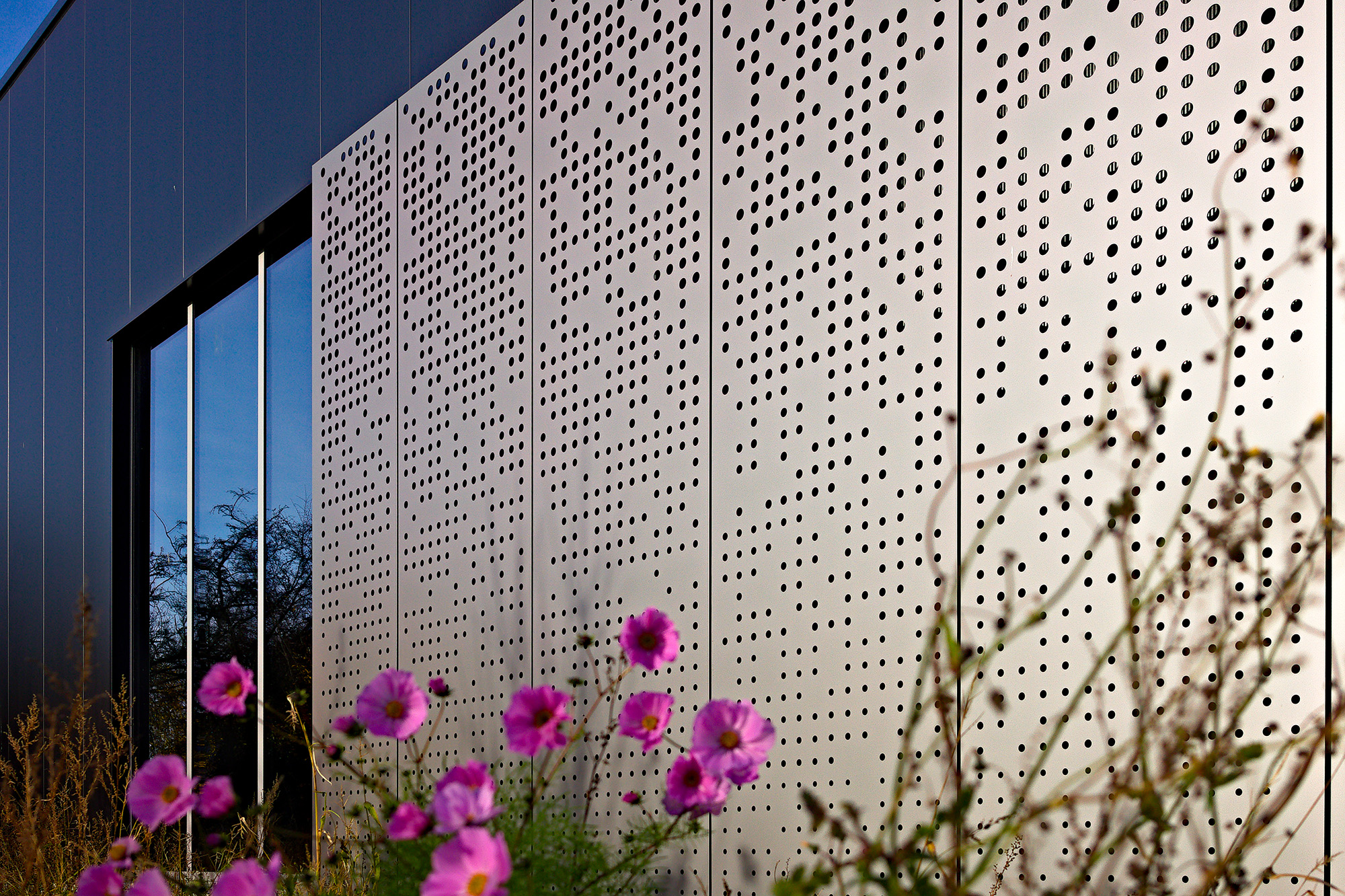 Le solde de la parcelle a fait l’objet d’une étude paysagère et est planté d’arbres, de haies taillées et vives, de zones enherbées,… de manière à conserver et renforcer la biodiversité .Afin d’être intégré au voisinage, la partie latérale et arrière qui jouxtent les jardins sont plantées et où aucune zone de travail /stockage n’est autorisée, les baies sont fixes excepté les 2 petites portes de secours obligatoires. Les accès parking ; portes, fenêtres ouvrantes, techniques, sont tournés vers l’avant en lien avec l’activité du PAE.